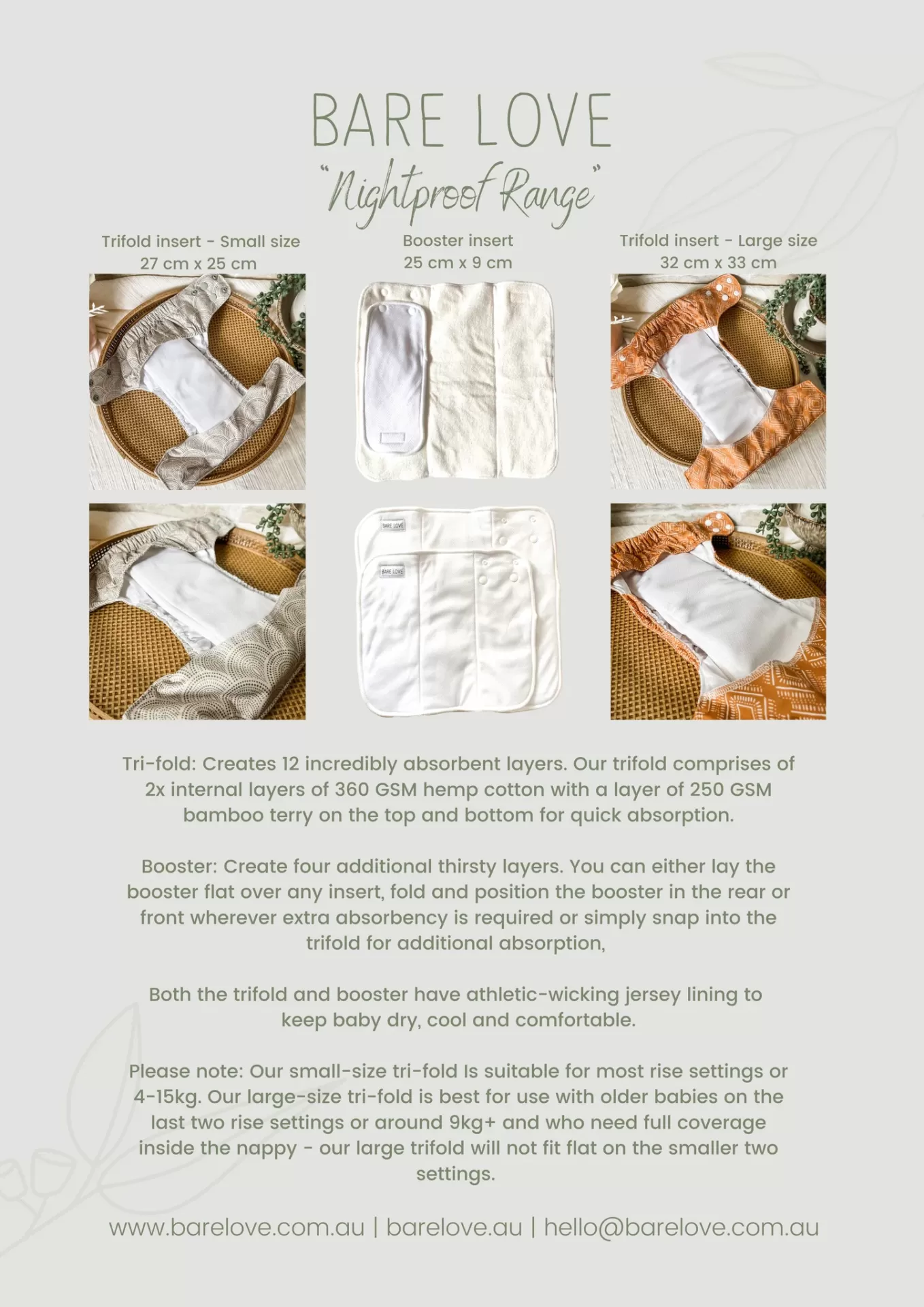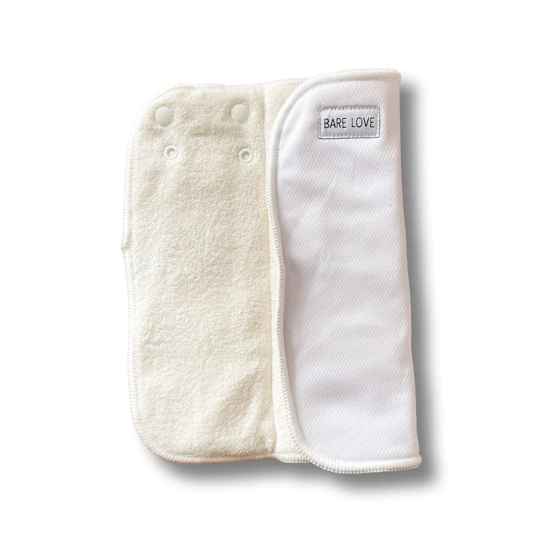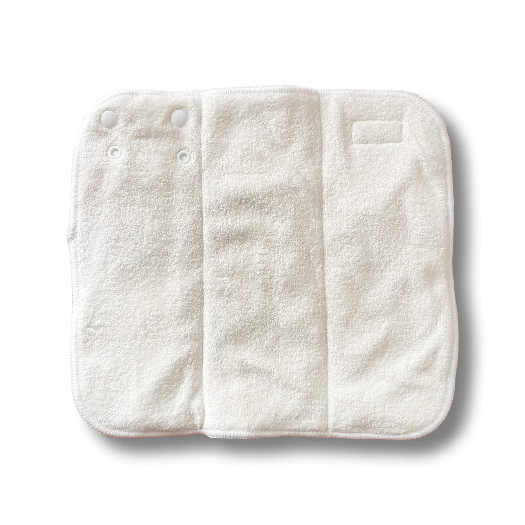 - Inclui 2 absorventes que prendem por molas entre si e à fralda: um absorvente trifold, composto por 2 camadas internas de algodão e cânhamo - 360GSM e duas camada externas de bambu terry 250 GSM; um booster que apresenta a mesma composição que o absorvente trifold. Os absorventes podem prender á fralda na parte da frente ou na parte de trás desta