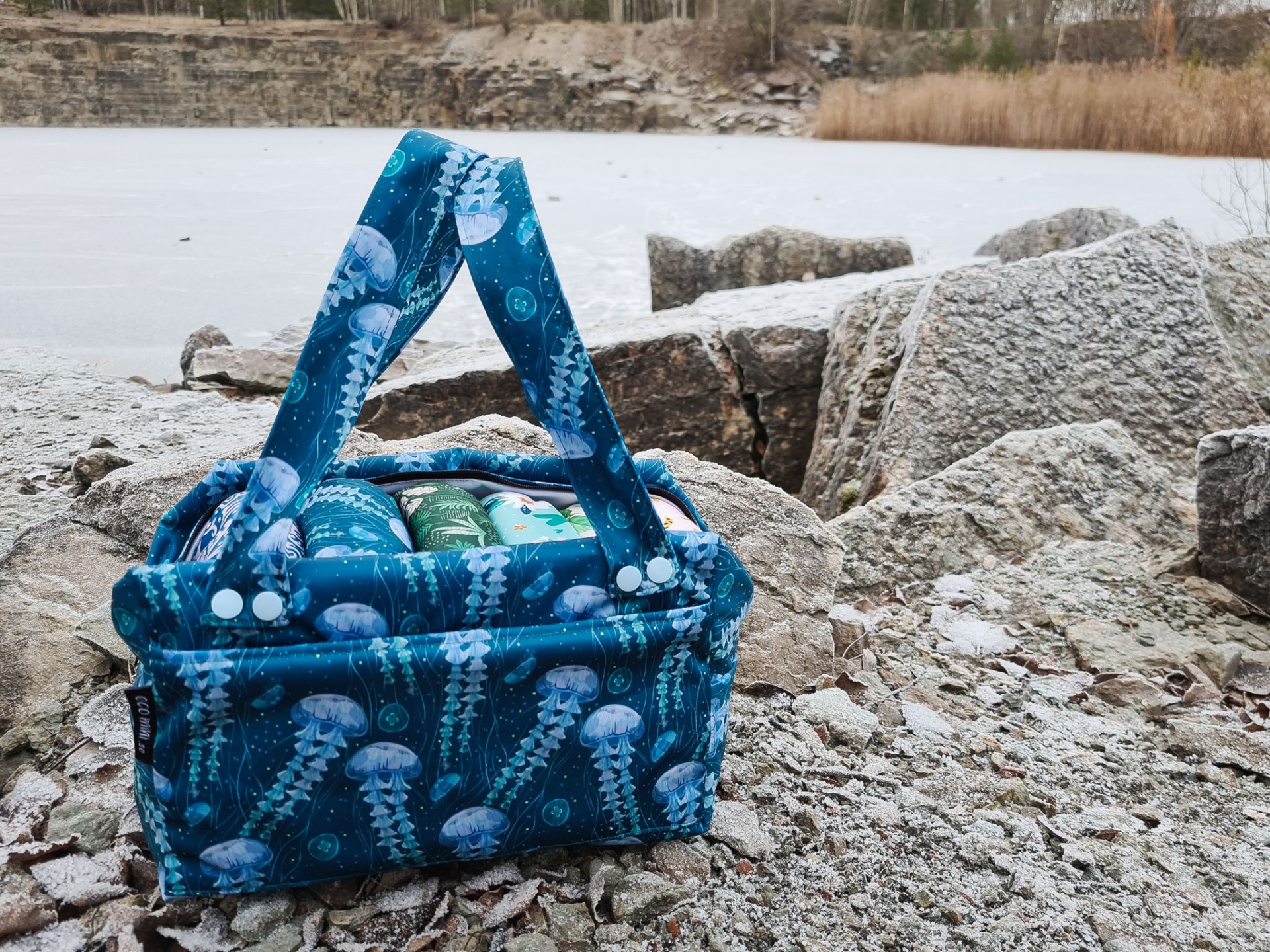 - Saco Pod com dupla camada de PUL e capacidade para cerca de 10 fraldas reutilizáveis de tamanho único;